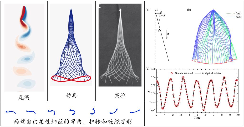 本研究方向主要通过数值模拟方法研究流体与柔性结构之间的相互作用,旨在揭示其耦合机制和动力学特性。通过分析流-固耦合现象,不仅可以深入理解自然界中生物体运动的力学原理,还能为流动控制和能量采集提供理论支持。目前课题组在纤维和细丝等柔性体的运动仿真开展了大量的工作,所构建的基于GPU加速的浸入边界-格子玻尔兹曼方法能够处理任意大变形结构的流固耦合。