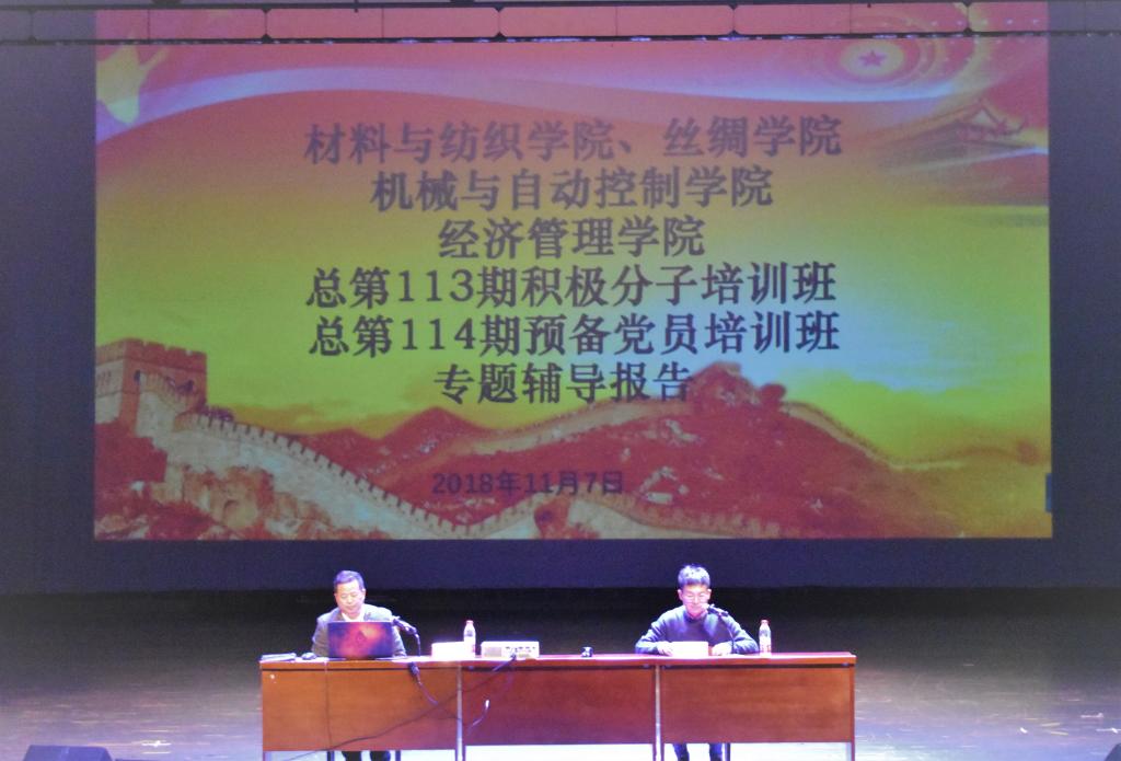 分党校与材料与纺织学院、丝绸学院分党校,以及经济管理学院分党校在我校大剧院共同举办总第113期积极分子培训班、总第114期预备党员培训班专题辅导报告会。马克思主义学院教师王继全老师,浙江省2018年度“万名好党员”入选者、校团委副书记方翔为学员们授课。报告会由机控学院党委组织员王淯霄老师主持。