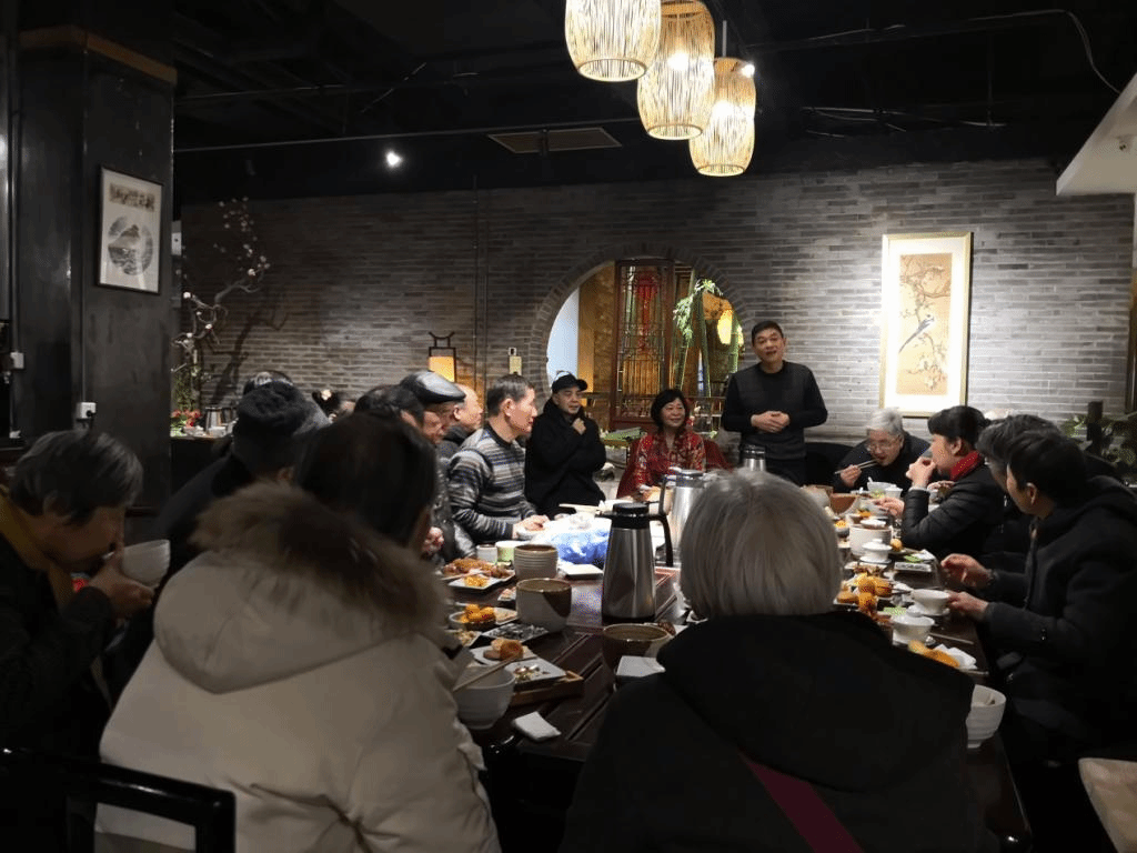 在青藤茶馆(南山路店)举行离退休教工迎新春茶话会。学院党委书记潘海鹏、工会主席刘宜胜和办公室主任沈晓斐参加。