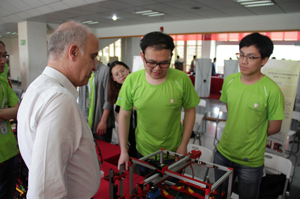 的9支参赛代表队获得了5个一等奖、3个二等奖、1个三等奖的历史佳绩。一等奖作品分别为复合式三轴移动停车装置(由杨金林、赵德明指导,成员为周佳颖、窦岩杰、孙晓航、张荣滔、徐继垦)、智能立体小型停车装置(由杨金林、张国凤指导,成员为陈锦鸣、张鹏勇、张钿、王郁、周哲佳)、智能无干扰立体车库(由马善红、杨金林指导,成员为苏冉、沈晓强、齐希阳、李翔毅、陈培杰)、双行式半自动手推式菠萝采摘收集机(由杨金林、杜小强指导,成员为张谦、余润尧、李禹、郑梁梁、黄皓杰)、辅助人工菠萝采摘机(由马善红、俞亚新指导,成员为龚骏飞、肖扬、张国建、王帅、叶方成)。除此之外,我校还获得了特别贡献奖。同时,在大赛闭幕式的最后环节中,全国大学生机械创新设计大赛组委会秘书长王晶教授、德国慧鱼集团国际事务总监劳伦斯先生、机伦理电影