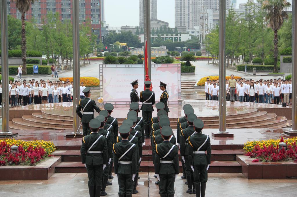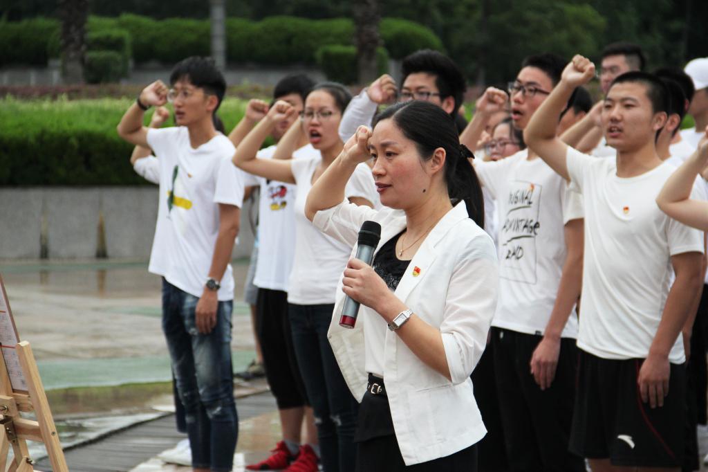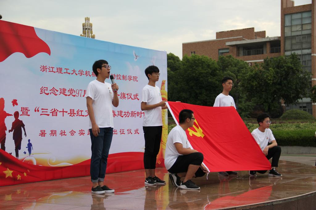 的党员们在校世纪广场举行了庄严的升旗仪式。本次升旗仪式的主题是庆祝建党97周年,同时也是学院“三省十县红文化•青春建功新时代”暑期社会实践团的出征仪式。参加仪式的有学院党委副书记苏丽辉,团委书记、学工办主任方水明,各年级辅导员,新发展党员、学生党员代表以及暑期社会实践团代表。仪式由方水明主持。