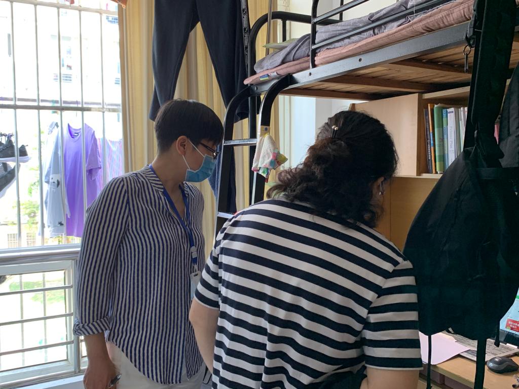 胡明一行走访了生活一区2号楼大一女生寝室,了解女同学学习生活的情况。胡明仔细询问了学生上网课的情况,询问了学生返校后对于疫情防控的看法。她强调,特殊时期要增强自身学习的自觉性和主动性。随后,胡明一行走访了B7、A2等学生楼,每位老师就学生毕业设计、考研、找工作等情况进行了询问和指导。