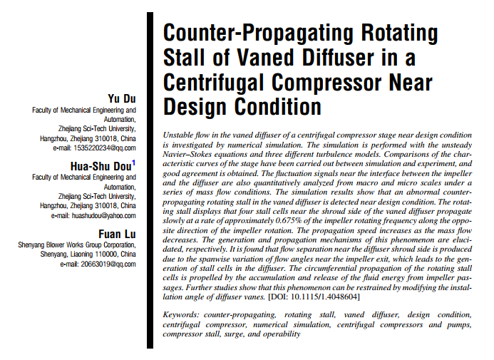 硕士研究生杜昱同学以第一作者身份在国际著名期刊《ASME Journal of Turbomachinery》发表长达19页(双栏)的研究论文,论文题目Counter-Propagating Rotating Stall of Vaned Diffuser in a Centrifugal Compressor Near Design Condition(离心压缩机近设计工况叶片扩压器的反向传播旋转失速),通讯作者为导师窦华书教授。