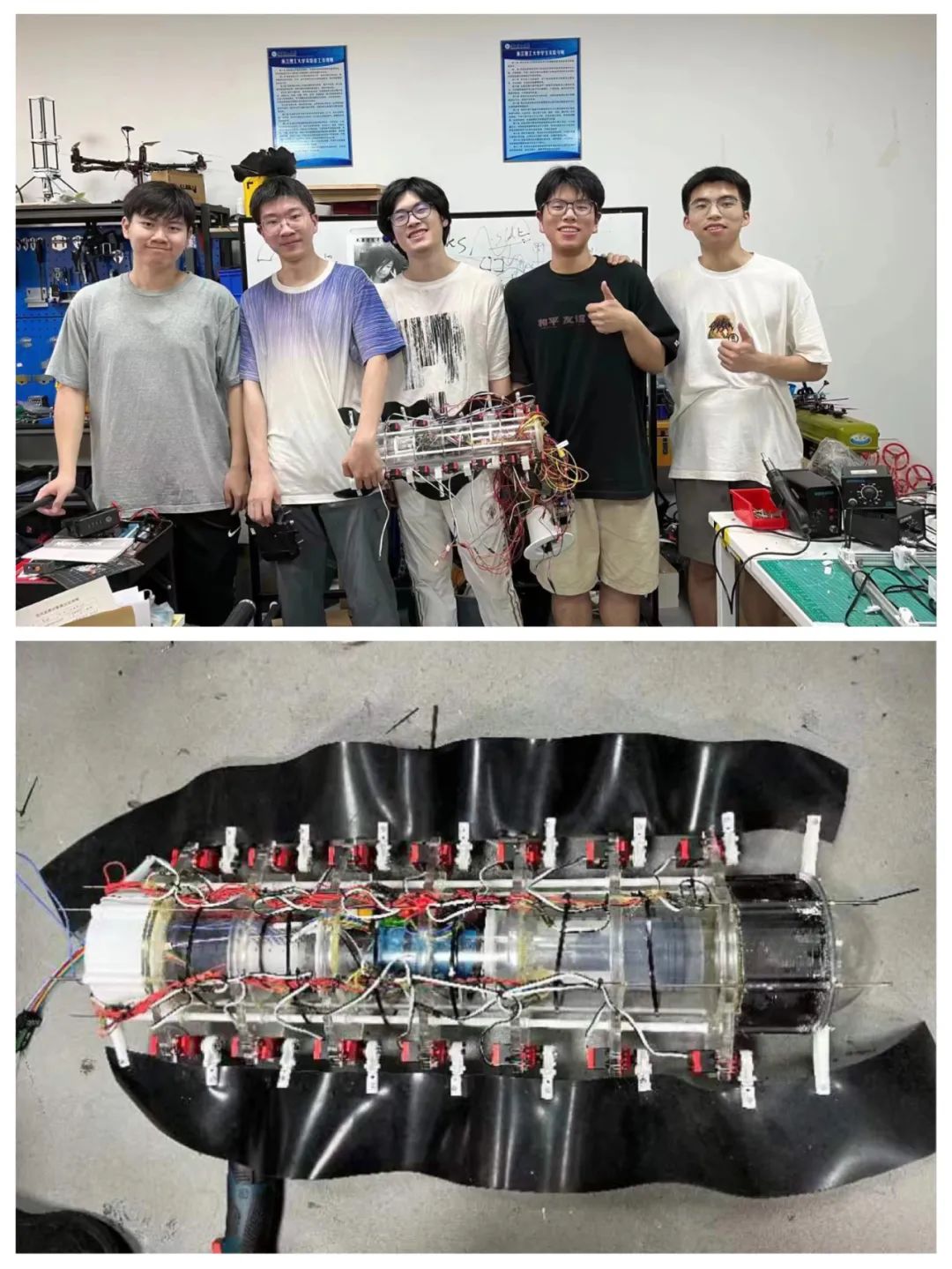 作品简介:本海鬣蜥仿生机器人主要用于户外复杂环境的生态监测,在户外滩涂、小溪、沙滩等传统机器人不方便的环境进行生态检测活动。首先在陆地上两自由度腿部支撑身体,舵机驱动腿部进行步态规划,实现在陆地上各种地形的爬行,在水下四足收至身体两侧,通过绳驱动尾部摆动向前游动,以及身体内部重心调节器调节机体仰俯姿态实现沉浮。本海鬣蜥仿生机器人采用潜水舵机,机体严格密封设计,另配备陀螺仪辅助进行精细化姿态控制,更可通过蓝牙模块进行远程控制海鬣蜥仿生机器人的运动以及模式转变,操作简单易懂。