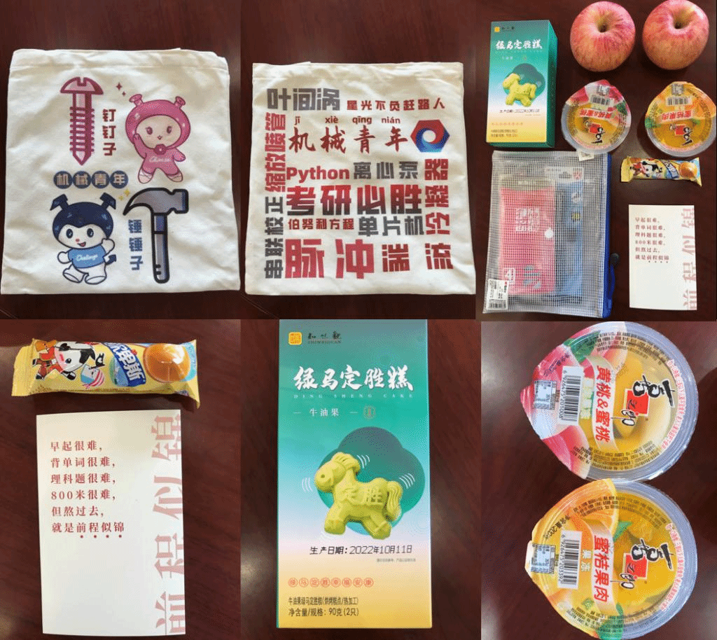 学院为考研学子精心准备“考研暖心礼包”,每一份礼物都寄托着学院对考研学子们的亲切关怀和殷殷祝福。牛奶代表着“牛”气冲天,定胜糕代表“糕”枕无忧,苹果象征着“苹”安上岸,果冻代表“果”然有你,棒棒糖代表“棒”上有名,一封写给自己的明信片以及考研专用文具套装,一件件寓意丰富、心意满满的物品被塞进了礼袋。