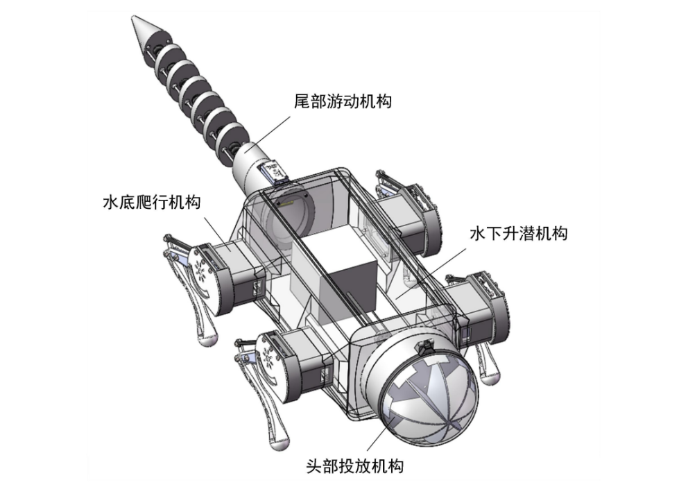 作品概况:该仿生海鬣蜥机器人主要适用于对水下微型传感器的投放工作,可优化水下传感网络。该机器人机械结构主要分为头部投放机构、水底爬行机构、尾部游动机构和水下升潜机构。头部投放机构主要实现传感器投放,通过旋转阀转动使每个舱内的传感器节点下落布置;水底爬行机构主要实现水底运行,通过四条腿支撑机身,每条腿均有两个自由度,且分别由两个舵机驱动,四条腿组合可实现在水底各种地形的爬行;尾部游动机构主要实现水域运行,游动时,四足收起,通过尾部摆动提供向前的动力,水下升潜机构主要实现升潜,其原理主要是通过对整机重心的前后调节来实现升潜;通讯模块采用基站长波通讯,操控人员可以用所设基站对机器人进行信号指令的发送,使机器人获取到目标点的定位。本机器人采用的舵机及机体均经过密封防水设计,重心接近底盘运行稳定,且操作简单易懂。