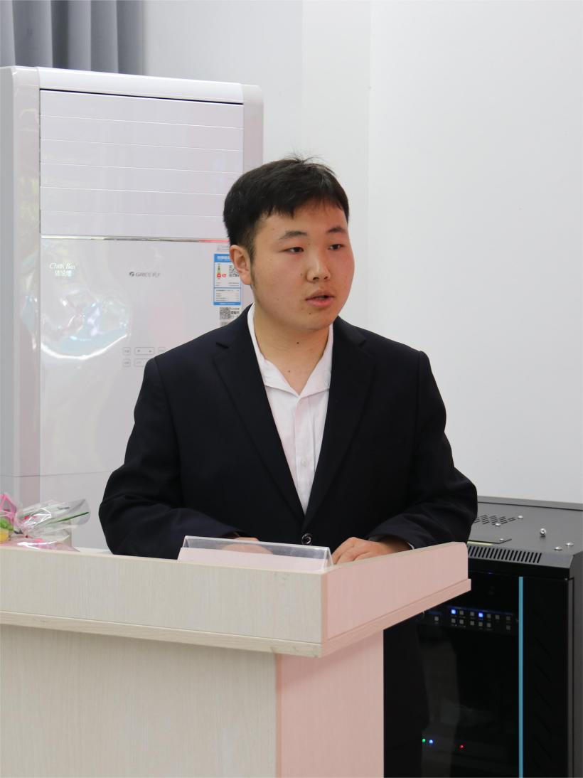 获奖学生代表冯俊澄进行发言,他汇报了自己在学业、科研、竞赛、志愿等方面的成绩,向美仪公司的资助表示感谢,并为美仪公司的三位代表敬献由获奖同学们手工制作的鲜花。