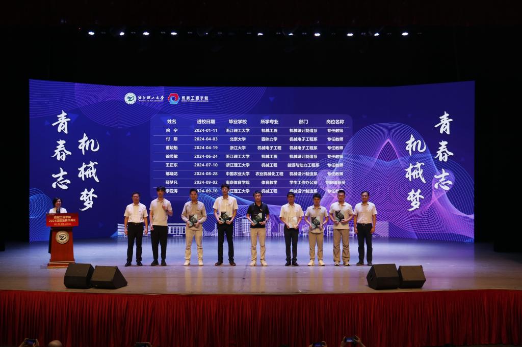 而后举行了学院新进教师入职仪式。苏志俭、李秦川为新教师颁授校徽与《机械工程学院青年教师生存手册》成长宝典,向新加入机械“大家庭”的青年教师表示热烈欢迎。