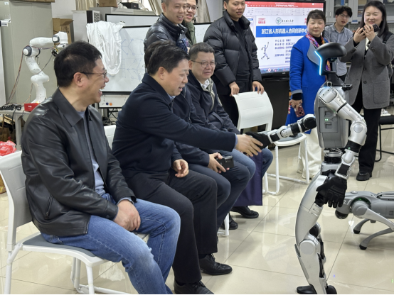 在随后的调研中,荣安华一行现场观摩了人形机器人、仿生机器狗的演示操作,深入了解了不同类型机器人在性能设计、应用场景及产业前景等方面的优势特点。来访嘉宾还亲身体验了人机交互系统,对前沿智能技术在服务、教育、康复等领域的广泛应用有了更加直观的认识,并对中心在人工智能与智能制造领域所取得的成果给予了高度评价。