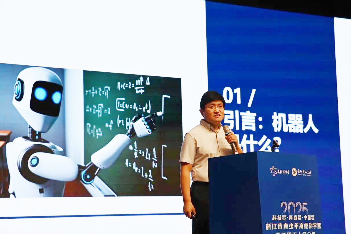 陈刚教授为营员们带来题为《从蹒跚学步到击水弄潮:机器人发展与思考》的报告分享。他以“机器人是什么”引入,向同学们介绍了机器人的概念,以及四足机器人、人形机器人、水下机器人的发展史、发展历程、应用场景等,带领现场学生目睹了机器人从笨拙的“学步者”,历经机械臂的精准、工业机器人的普及、服务机器人的兴起,到如今智能机器人展现出“击水弄潮”的非凡能力。