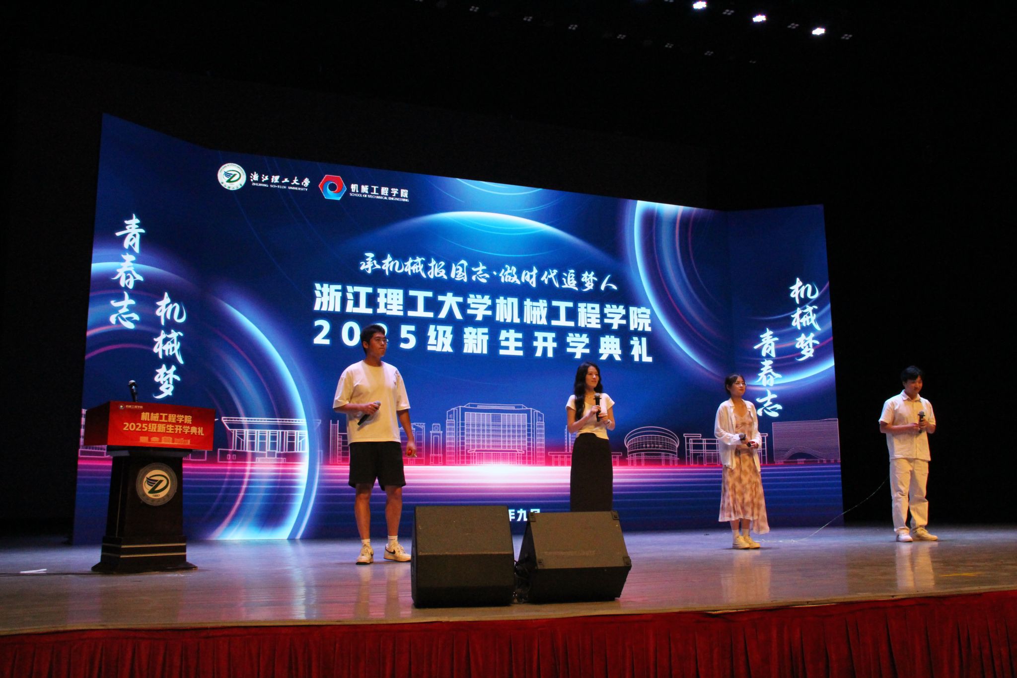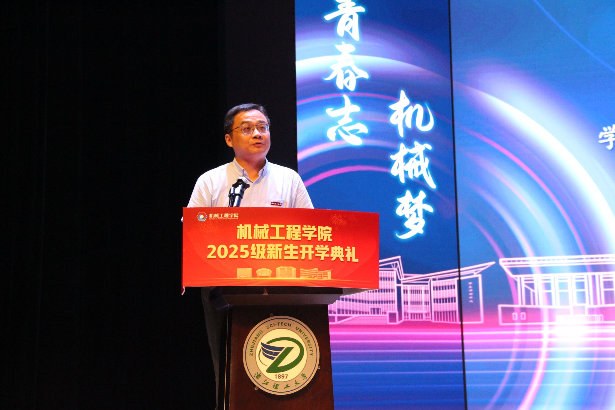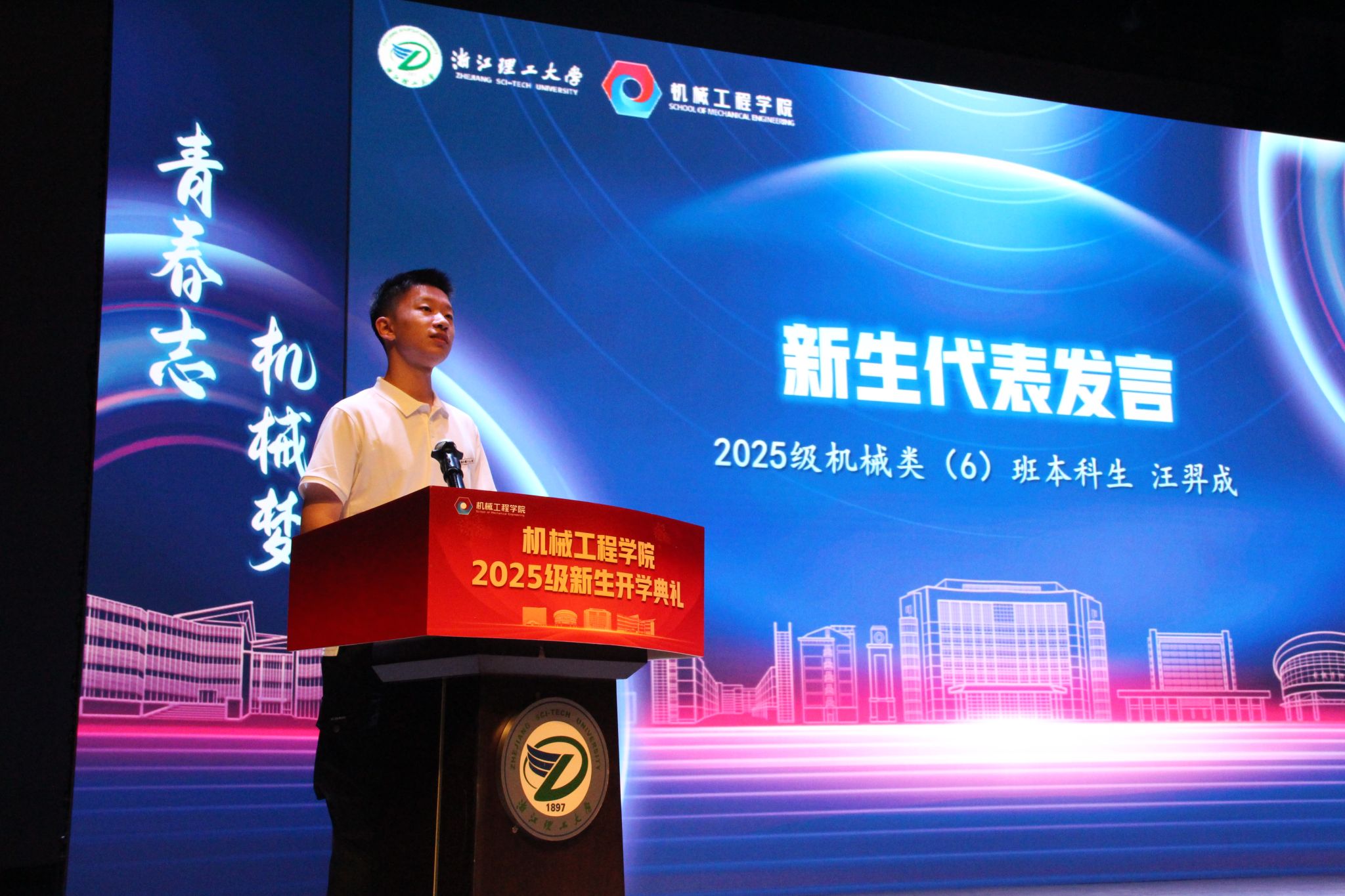 新生代表、2025级机械类(6)班本科生汪羿成则以“缘定浙理、初识浙理、扬帆浙理”为主题,分享了自己选择浙理机械的初心。他表示,从“机械报国”的理念中读懂了责任,从师长校友的故事中看到了未来,未来将以“求知若渴、笃行不怠”的态度,在浙理追逐热爱、成就自我,展现出新生一代的朝气与决心。