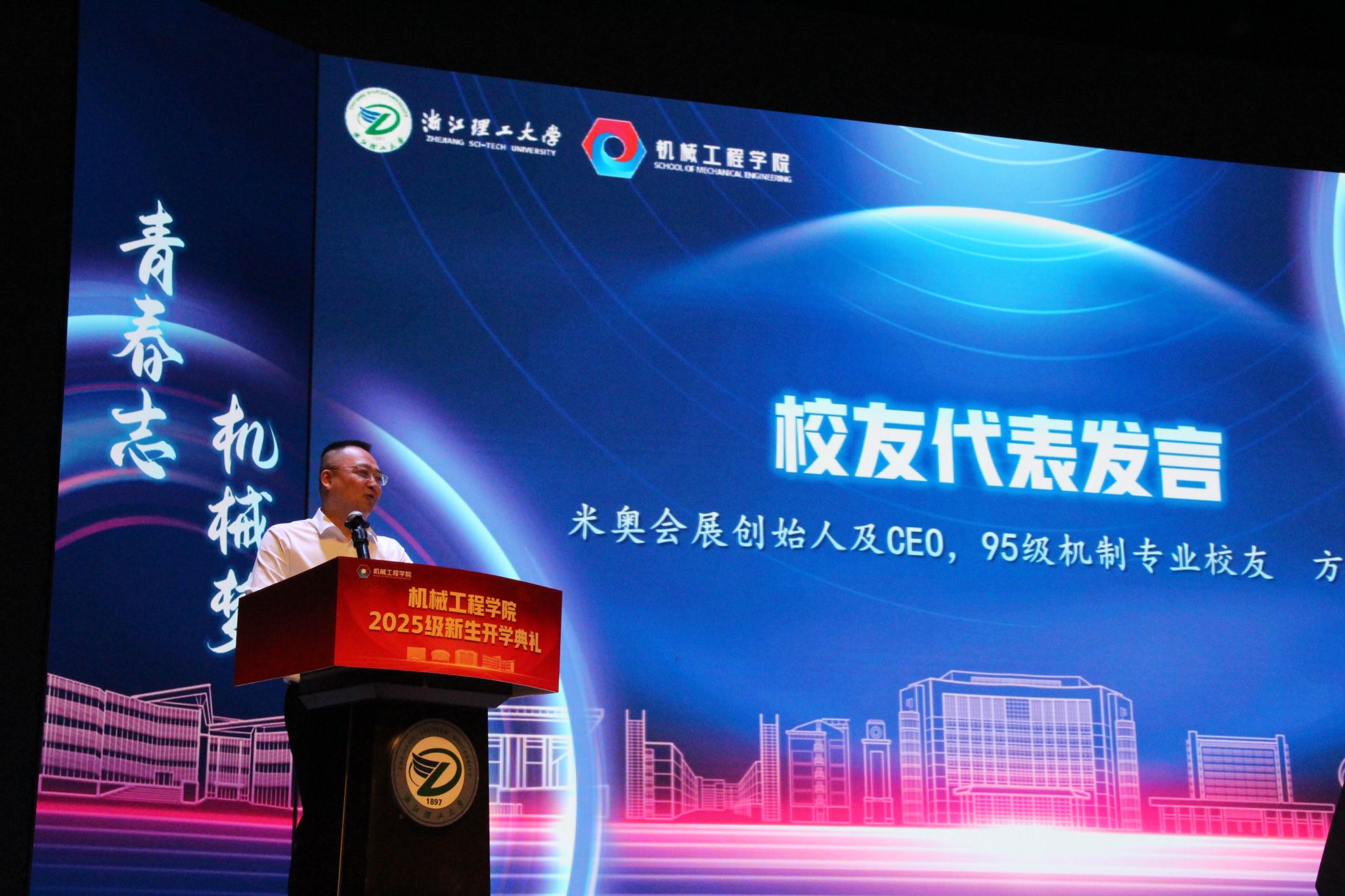 作为校友代表,95级机制专业校友、米奥会展创始人及 CEO 方欢胜深情回顾了自己在浙理的求学时光。他以“从机械学子到行业创业者”的成长经历为例,鼓励新生们以破釜沉舟的决心学习,凭借选择赛道的智慧把握AI与机器人领域机遇,培养不可替代的领导力。他相信,不远的未来,新机械人会亲自讲述用AI改变世界的故事。